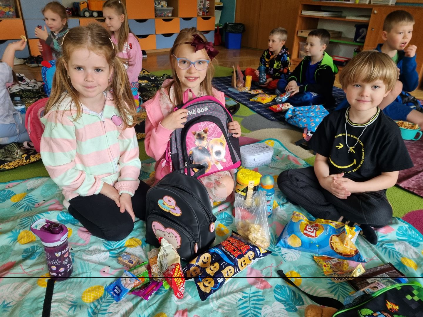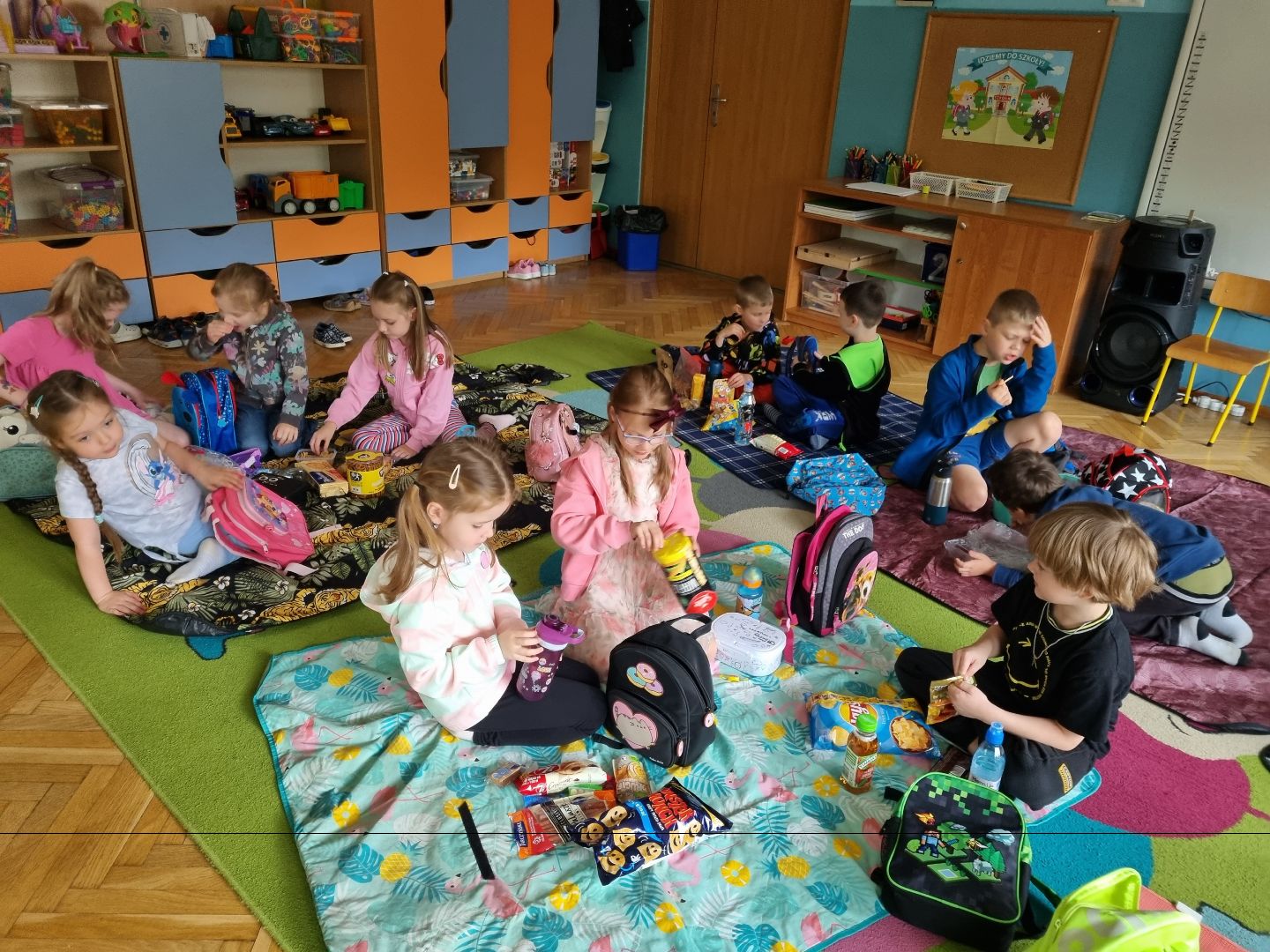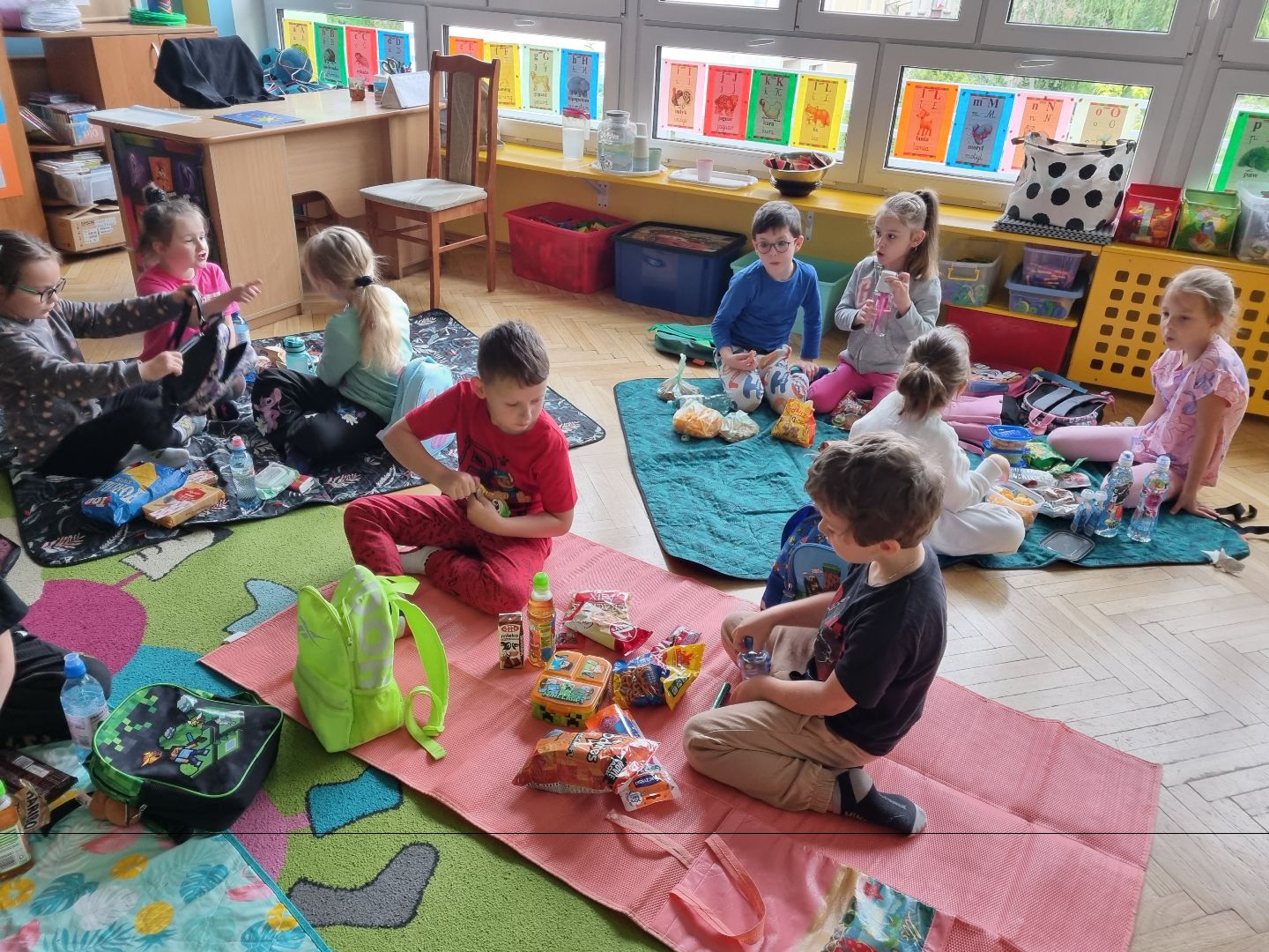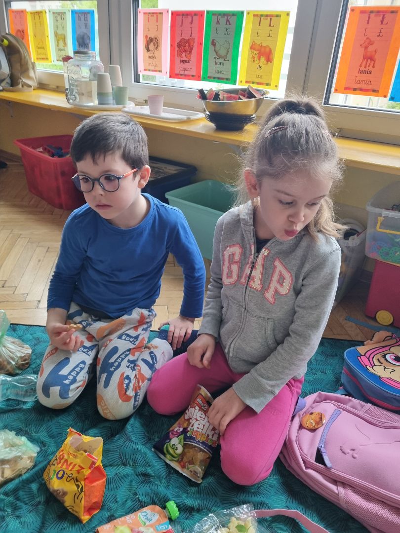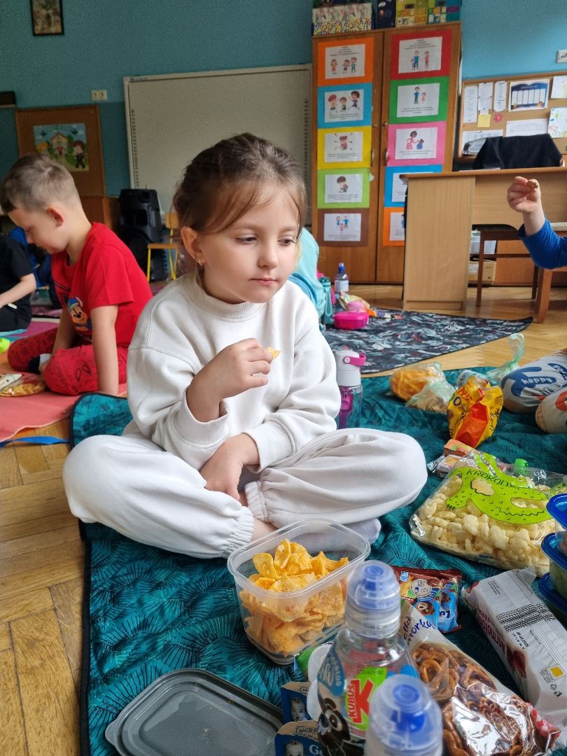 Dzisiaj Pszczółki przyszły do przedszkola z kocykami i plecakami pełnymi rozmaitych przekąsek, w pełni gotowe na pikinik pod chmurką. Niestety, tegoroczny czerwiec nie rozpieszcza nas piękną pogodą i musieliśmy nasz piknik.... zorganizować w sali! Dzieci rozłożyły swoje koce na dywanie i zajadały się smakołykami przygotowanymi przez Rodziców. "Pszczółki" z ochotą dzieliły się swoimi przekąsakmi, częstując się wzajemnie. Piknik, pomimo, iż w budynku, był naprawdę bardzo udany! Dziękujemy Rodzicom za przygotowanie plecaczków i kocyków!