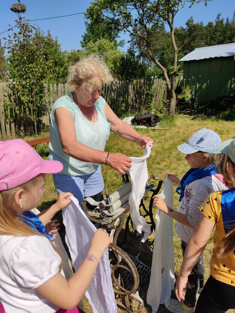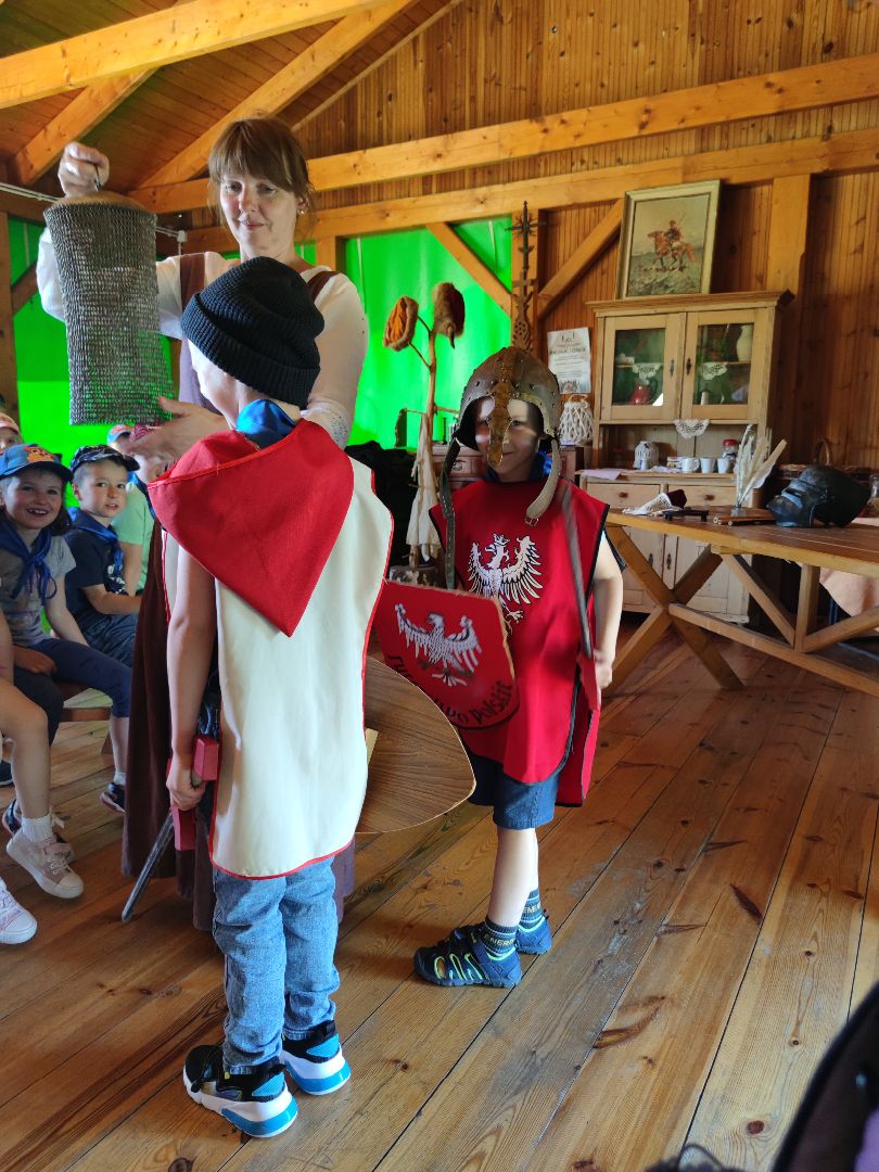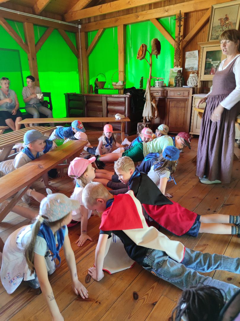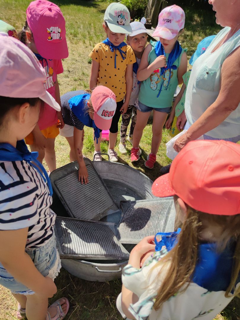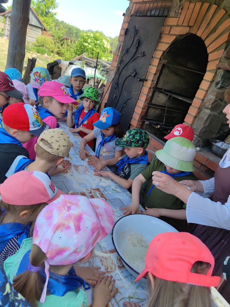 Dzieci miały okazje zapoznać się ze starymi obyczajami szlacheckimi oraz doświadczyć przykładów pracy z danych lat (pranie na tarze, prasowanie starym żelazkiem). Mieliśmy okazje wypiekać własne podpłomyki oraz zwiedzić znajdujące się na terenie wioski muzeum.
